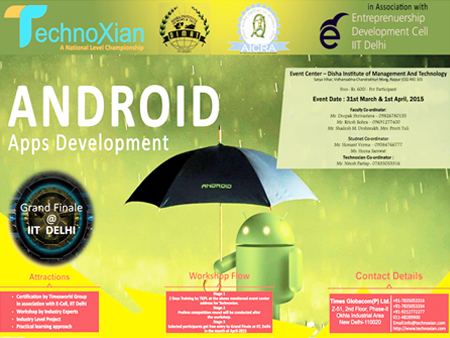Description of Event : Two day workshop on Android application development was organized on 31st March and 1st April 2015 by both EEE and CSE&MCA department, Mr. Umang Kejriwal was the resource person, 94 students were attended the workshop, 8 students were from Rungta, Raipur and BIT, Raipur. Out f 94 students 40 students were selected for the next level of contest which was held at IIT, Delhi.